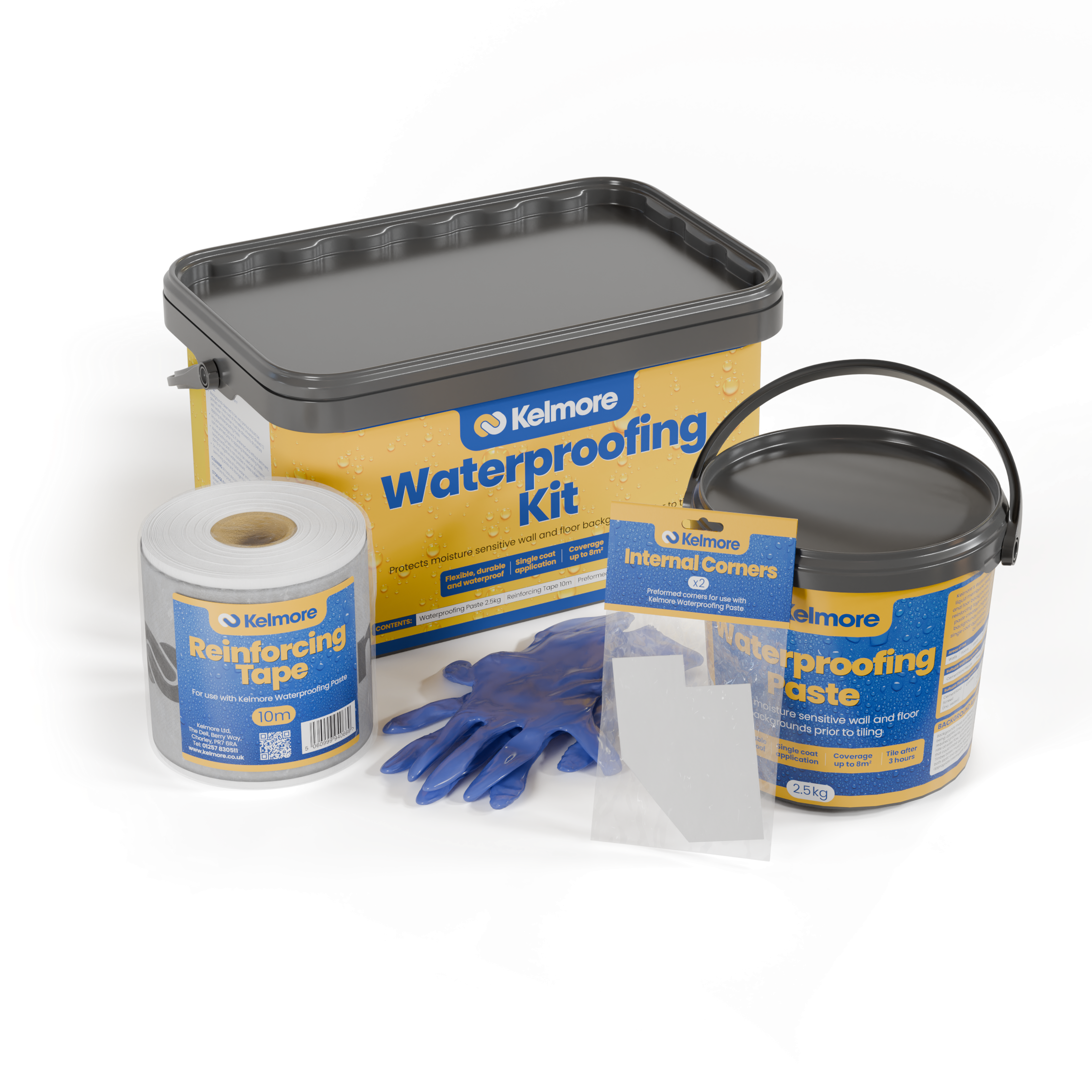 Kelmore’s Waterproofing Paste is a ready to use, rapid drying, liquid membrane designed to protect moisture sensitive wall and floor backgrounds in wet areas prior to tiling. Used in conjunction with Kelmore’s reinforcing tape and preformed corners, this highly polymer modified paste, once dry creates an extremely flexible waterproof layer, protecting backgrounds from potential water damage. Only requiring a single coat application, this self-priming, quick drying product enables tiles to be fixed after only 3 hours.